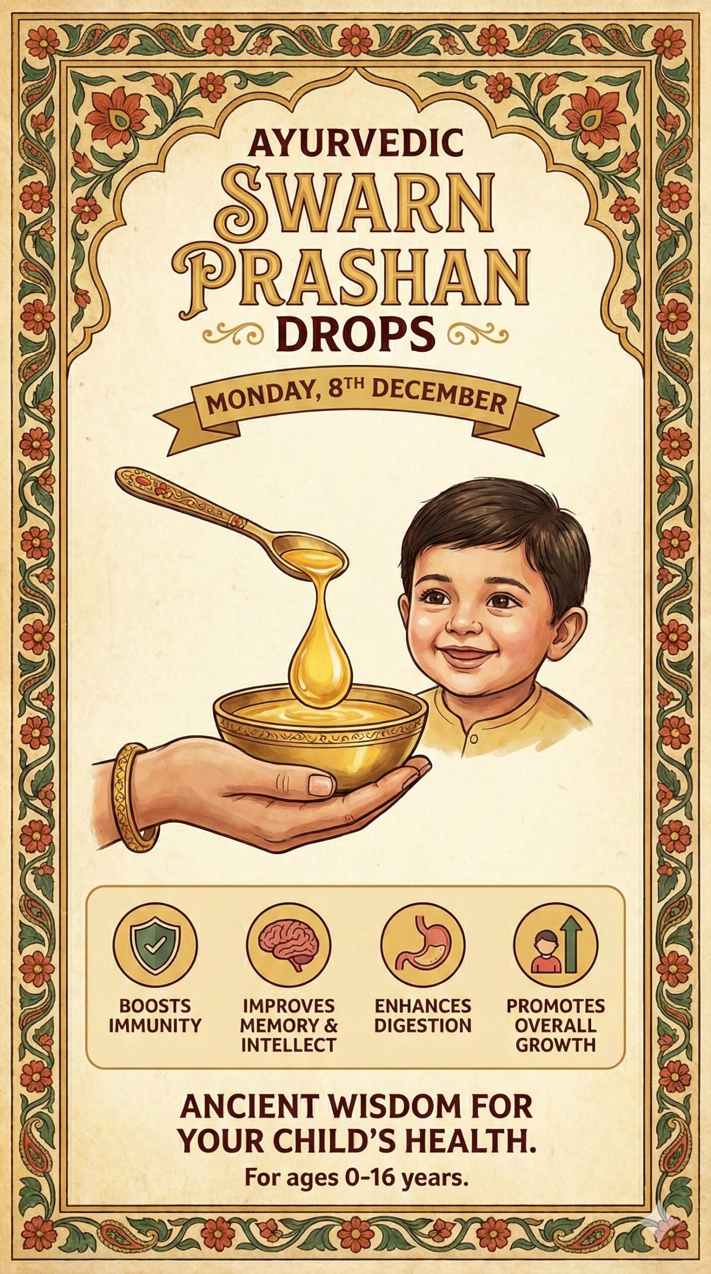 Can be given to age group of 0-16 years. It is done on every pushya nakshatra – an auspicious day which comes after every 27 days. Given swarna prashan on this day bestows excellent benefits. Shake well before use.